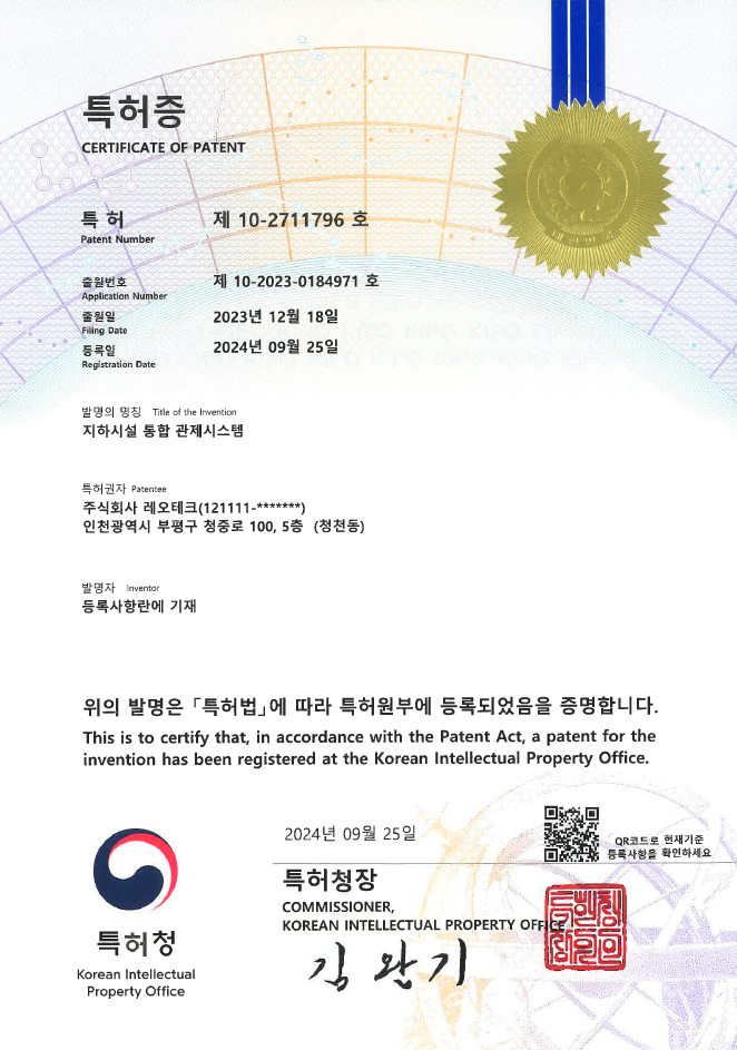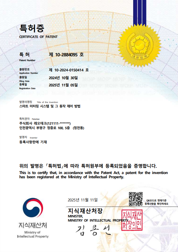PCT명칭 출원번호 스마트 수도미터 PCT/KR2022/018929 보안모듈이 적용된 원격 검침 시스템 PCT/KR2022/018936 보안 기능을 구비한 스마트미터링 시스템 PCT/KR2021/015271 로라 기반 원격검침시스템 PCT/KR2018/004037호 로라 기반 원격검침시스템 PCT/KR2018/004036호
