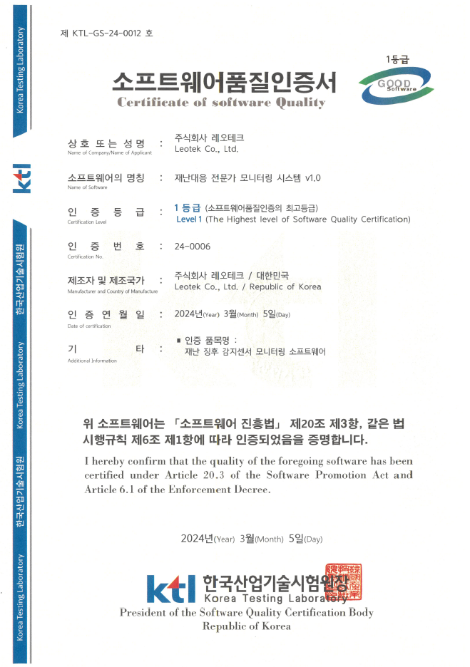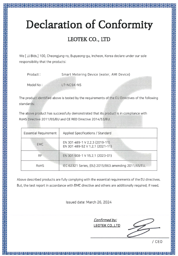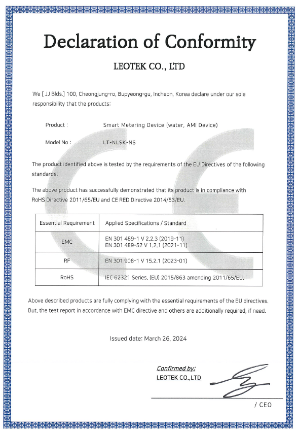 품목 허가(승인)번호 승인일자 Multi-rtu/LT-WM-G-CT(HRTU) R-R-LEK-LT-WM-G-CTHRTU 2021.02.03 원격수집기/LT-LWM-OHD-NB1 R-R-LEK-LT-LWM-OHD-NB1 2021.01.05 원격수집기/LT-LWM-MD-Q R-R-LEK-LT-LWM-MD-NB-Q 2020.11.06 수질분석기/LT-WQ-M R-R-LEK-WQ-M 2020.05.08 원격수집기/LT-LWM-MD-NB1 R-C-LEK-LTLWMMDNB1 2020.05.08 수질분석기/LT-WQ R-R-LEK-LT-WQ 2020.03.12 Multi-rtu/LT-WM-G-SECT(RTU) R-R-LEK-LT-WM-G-SECT 2020.02.20 원격수집기/LT-LWM-OHD-LWS R-R-LEK-LT-LWM-OHD-LWS 2019.10.30 원격수집기/LT-LWM-OHD-LW1 MSIP-REM-LEK-LTLWMOHDLW1 2019.05.27 Multi-rtu [LT-WM-G-CT(RTU)] MSIP-REM-LEK-LT-WM-G-CTRTU 2019.05.14 원격수집기/LT-LWM-OHD-LW2-P R-R-LEK-LT-LWM-OHD-LWP 2018.05.03 원격수집기/LT-LWM-MD R-REM-LEK-LT-LWM-MD 2018.01.30 원격수집기/LT-LWM-OHD-LW2 MSIP-REM-LEK-LTLWMOHDLW2 2017.05.01 RFID/SUN용 무선기기(900MHz 대역 사용기기)[LT-LWM-OHD] MSIP-CRM-LEK-LT-LWM-OHD 2016.03.08 RFID/SUN용 무선기기(900MHz 대역 사용기기)[LT-LWM-EDM] MSIP-CRM-LEK-LT-LWM-EDM 2016.02.29 IMT이동통신용무선설비의기기(기타) MSIP-CRM-L다-LT-WM-G-CTCDM 2016.03.10 FID/SUN용 무선기기(900MHz 대역 사용기기)[LT-LWM-NC] MSIP-CRM-L다-LT-LWM-NC 2016.03.14 RFID/SUN용 무선기기(900MHz 대역 사용기기)[LT-AT] MSIP-CRM-LEK-LT-AT 2016.01.04 IMT이동통신용 무선설비의기기(기타)[LT-WM-G-CT(RTU)] MSIP-CRM-LEK-LT-WM-G-CT 2014.02.18 특정소출력무선기기(900MHZ)[LT-R920-CP] MSIP-CRM-LEK-LT-R920-CP 2013.10.18 특정소출력무선기기(LT-SAD) KCC-CRM-LEK-LT-SAD 2013.04.09 특정소출력무선기기[LT-WM-G-CT(THS)] KCC-CMM-LEK-LT-WM-G-CT-THS 2013.01.03 특정소출력무선기기[LT-LWM-WW-LCD-B-SH] KCC-CRM-LEK-LT-LWMWWLCDBSH 2012.08.03 RFID/USN용무선기기(900MHZ)[LT-LWM-WW-LCD-S] KCC-CRM-LEK-LWM-G-CT-S-LCD 2012.01.02 RFID/USN용무선기기(900MHZ)[LT-LWM-G-CT-S] KCC-CRM-LEK-LWM-G-CT-S 2012.01.02 특정소출력무선기기[LT-WM-G-CT(PMS)] KCC-CRM-LEK-WM-G-CT 2011.07.04 특정소출력무선기기[LT-LWM-WW-LCD] KCC-CRM-LEM-LWM-WW-LCD 2011.05.30 특정소출력무선기기[LT-LWM-G-CT] KCC-CRM-LEK-LWM-G-CT 2011.05.30 특정소출력무선기기[LT-LWM-G-AR] KCC-CRM-LEK-LWM-G-AR 2011.05.30 특정소출력무선기기[LT-LWM-WW] LEK-LT-LWM-WW 2010.08.17 특정소출력무선기기[LT-CB-CT] LEK-LT-CB-CT 2009.10.19 특정소출력무선기기[LT-CB-AR] LEK-LT-CB-AR 2009.10.19 특정소출력무선기기[LT-CB-PB] LEK-LT-CB-PB 2009.09.23 특정소출력무선기기[LWM-WW] R-LARN-05-0225 2005.05.23 특정소출력무선기기[LWM-G] R-LARN-05-0327 2005.07.14